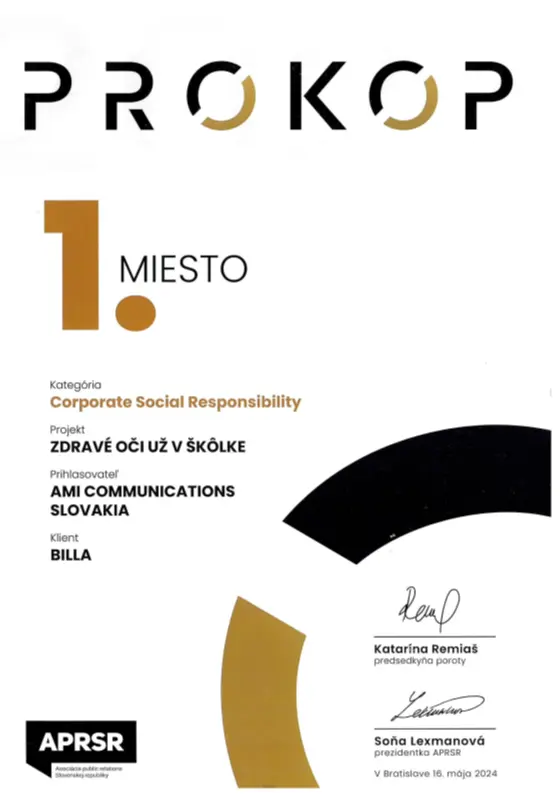 Vyhrali sme Slovenskú PR cenu PROKOP v kategórii CSR za projekt Zdravé oči v škôlke. Projekt, realizovaný v spolupráci s Úniou slabozrakých a nevidiacich a agentúrou AMI, vyšetril doteraz 113 000 detí na očné vady.